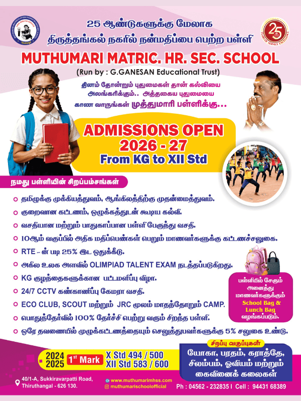 Established in the year 1994, Muthu Mari Matriculation Higher Secondary School, located in Thiruthangal, has grown into a beacon of knowledge, discipline, and holistic education. Under the steadfast guidance of the G. Ganesan Educational Trust, the school has been nurturing young minds with a strong foundation in academics, moral values, and all-round development.